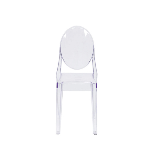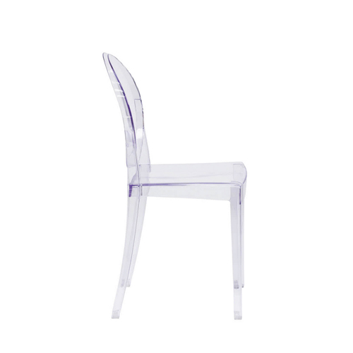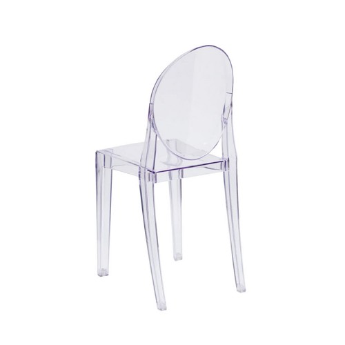 Outfit your modern indoor or outdoor dining area with this Flash Furniture FH-111-APC-CLR-GG Ghost transparent polycarbonate stackable side chair. Side chairs are also great for use in a lounge or waiting area. The transparent design emphasizes your business' color scheme with a subtle, sleek presence and is great for catered events or weddings. A sturdy polycarbonate construction is designed for both indoor and outdoor use for versatility and can be used in dining or office settings.